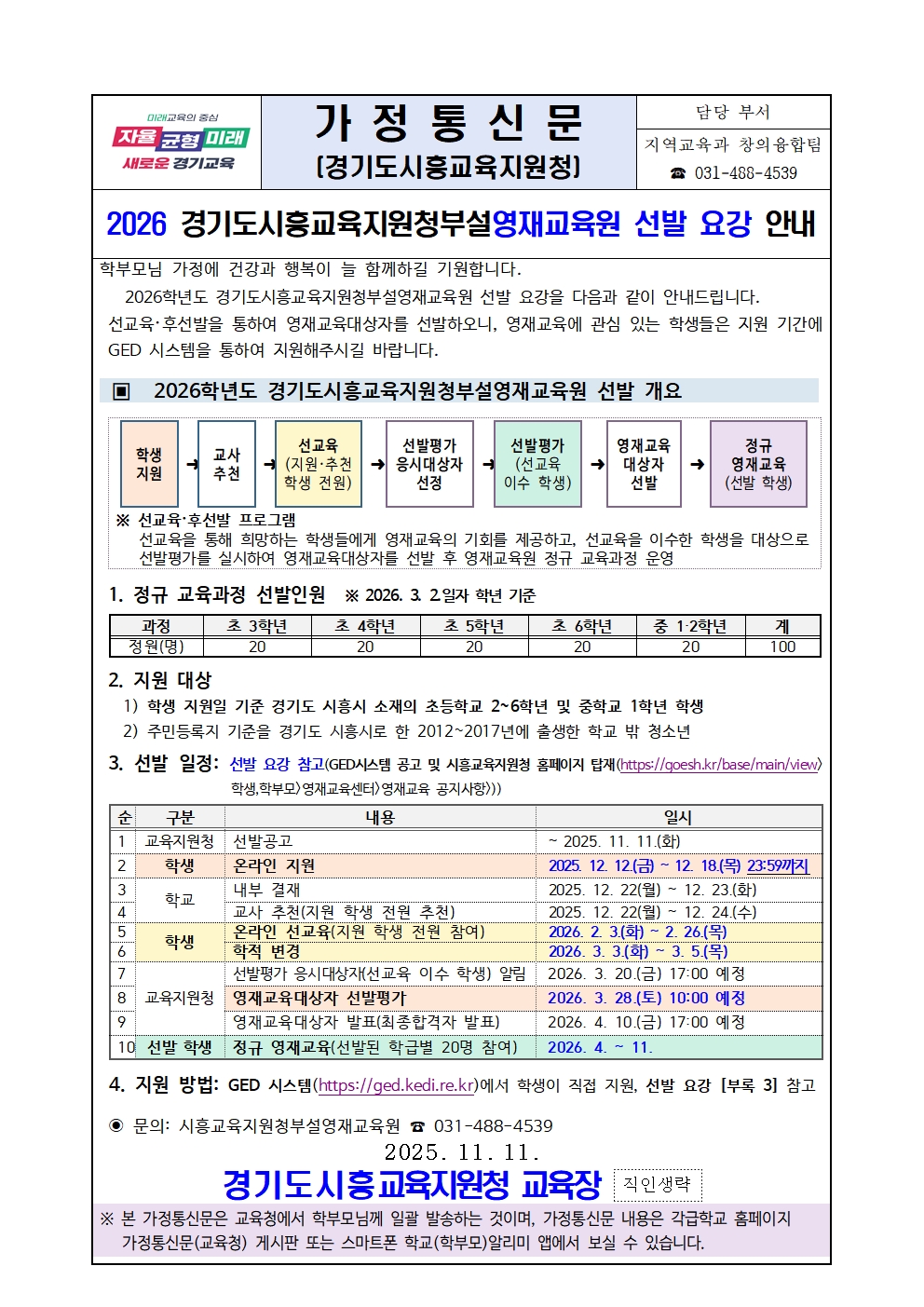 [¼±¹ß°úÁ¤ ¼öÁ¤] 2026 °æ±âµµ½ÃÈï±³À°Áö¿øÃ»ºÎ¼³¿µÀç±³À°¿ø ¼±¹ß ¾È³» °¡Á¤Åë½Å¹®001.jpg (878.94KB)